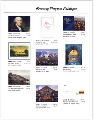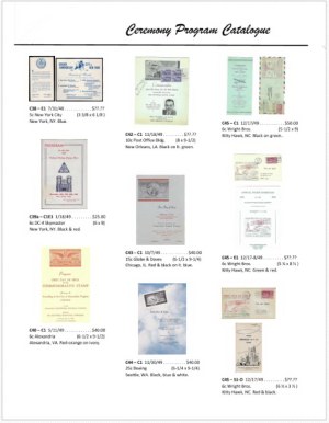 All programs’ illustrations are in full color. Pricing information is provided for programs issued through 1992. The catalogue includes listings of ceremony, event, and souvenir programs. Catalogue sections include commemorative and regular issues, semi-postal, airmail, special delivery, postage due, official mail, duck stamp, stamped envelopes, airmail stamped envelopes, official stamped envelopes, postal cards, airmail postal cards, and programs from the Philatelic Dedication Lecture Series. The catalogue concludes with a date listing of ceremony programs.